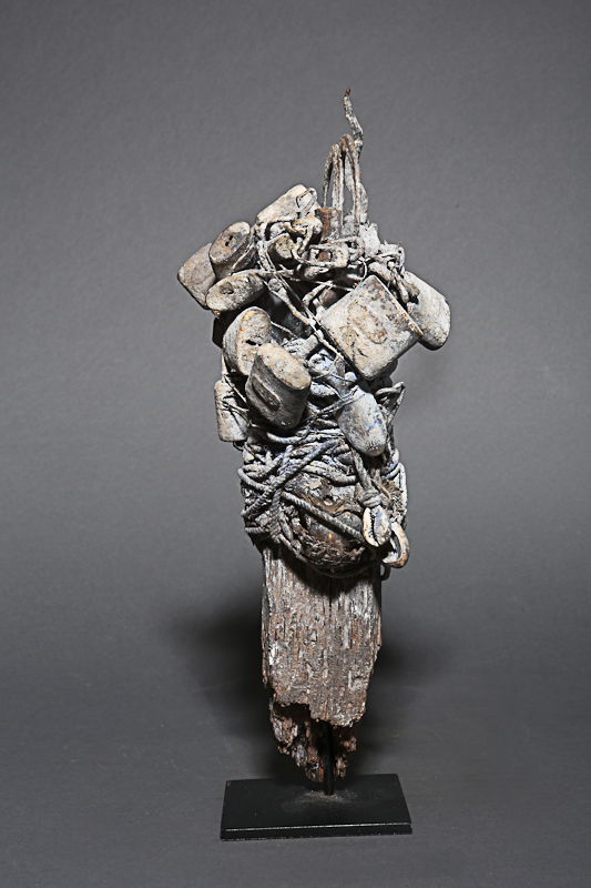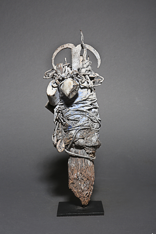 Ancien et puissant fétiche autel de protection et de contre-sorcellerie. C’est une sorte de Botchio qui devait être planté pour recevoir des libations répétées comme en témoigne la patine qui recouvre l’ensemble des charges magiques, médicinales, et les fers rituels avec lesquelles il est violemment ligoté et cadenassé …